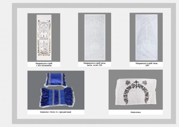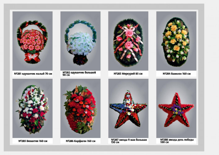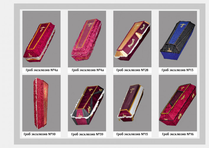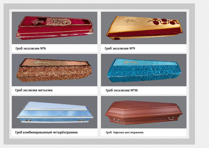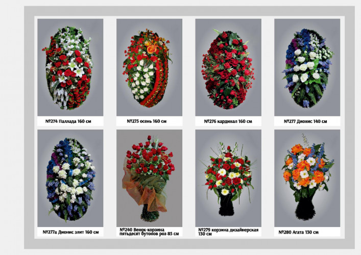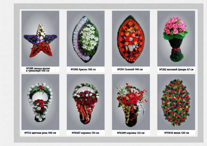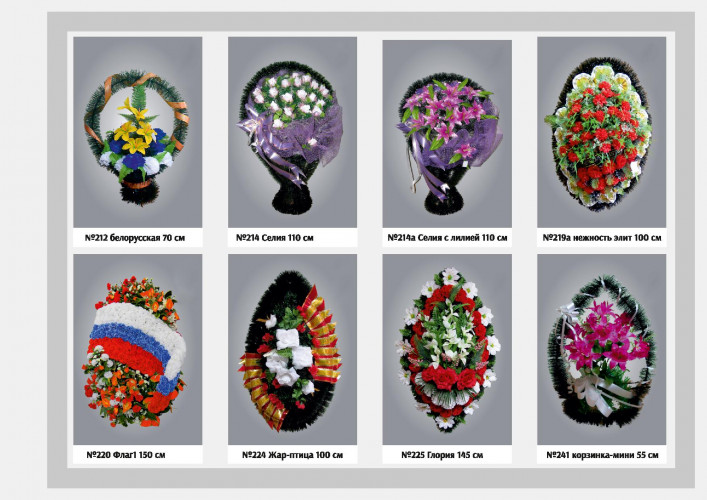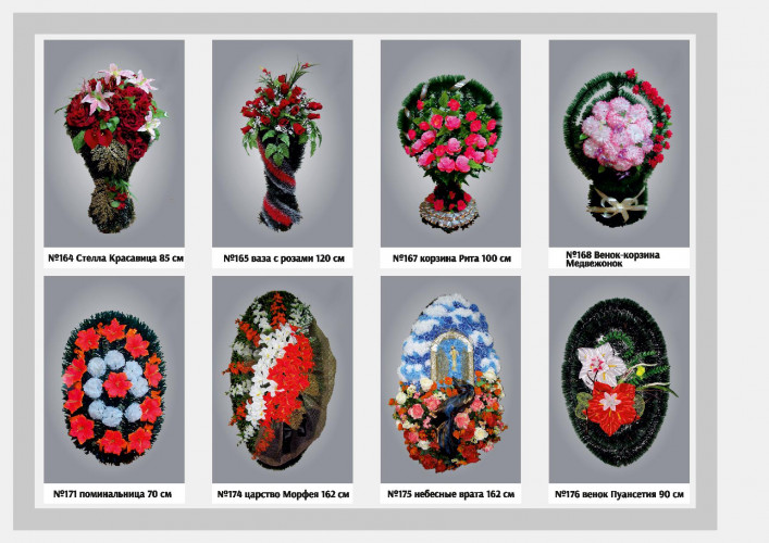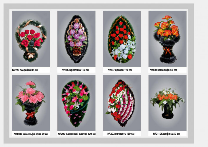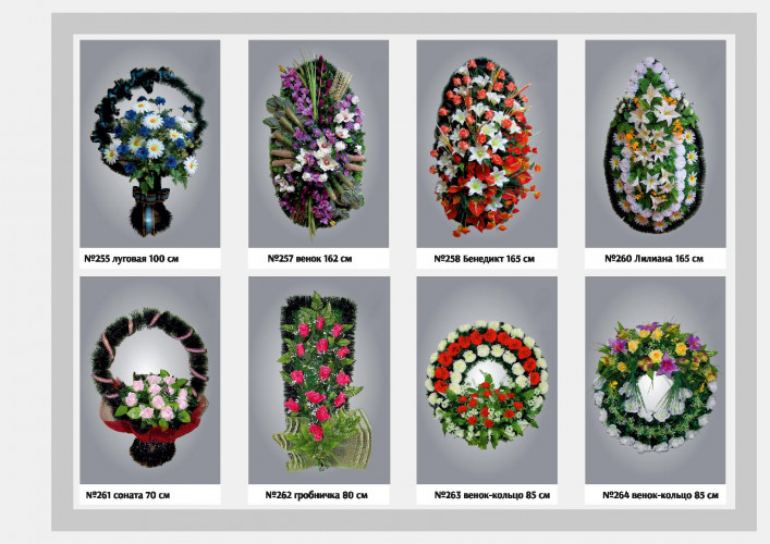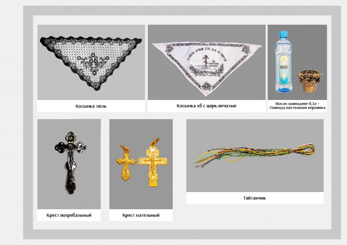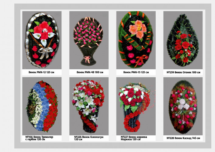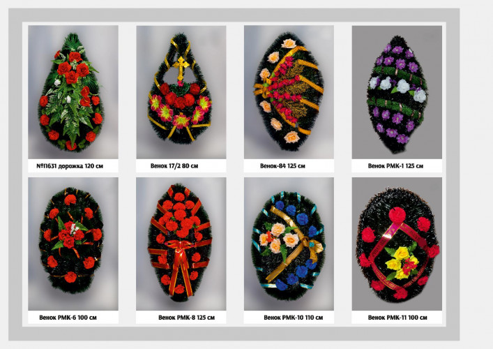 ООО «Тамбовская ритуальная компания» предоставляет весь спектр ритуальных товаров и принадлежностей: веночные изделия разных видов, исскуственные цветы (букеты и одиночные) гробы (полированные, комбинированные, обитые), стропы, деревянные кресты (сосна и дуб), погребальные комплекты (атлас, парча, стеганные, с принтом…), церковная утварь, свечи освященные (парафиновые и восковые), иконы, подсвечники, лампадки (стекло и керамика), ладан (разные ароматы), лампадное масло (0,5 л и 1 л.), мужская одежда, женская одежда, пояс («живые помощи» и погребальный), поминальный товар (полотенца, носовые платки…) и многое другое – всё есть в наличии!